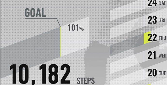 Шаг. Отображение прогресса цели. (Шаг установки цели подсчета очков: от 1000 до 50000, шаг 1000 шагов).