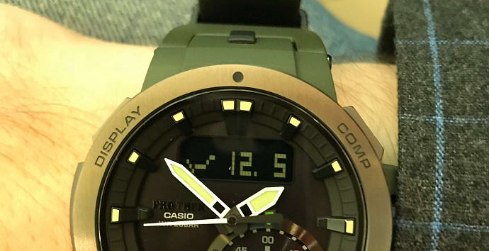 Наручные часы Casio PRW-7000 Multi-Field Line выпущены в мае 2017, предназначены для активных людей, поэтому многофункциональны. Они были и ранее, но появилось совсем уникальное решение. В нижней части циферблата есть еще одна шкала, она высчитывает приливы/отливы, являясь при этом настоящим «рыбацким календарем». Для заядлого рыбака такая информация позволяет точно высчитать оптимальное время для клева рыбы и отправиться за своей добычей. Функция идет дополнением ко всему функционалу, лишней она не будет, но никто прежде такой информации на циферблат не выводил. Модель Casio PRW-7000 не отличается уникальным и оригинальным дизайном, простота и лаконичность здесь в приоритете. Часы созданы для людей, которые постоянно выезжают за пределы города, которые редко одевают деловые костюмы. Такой пользователь будет больше ценить практичность, нежели уникальные дизайнерские решения. Супер светодиодная автоподсветка. При недостаточном внешнем освещении, поворот запястья обеспечивает яркую цветную подсветку дисплея часов.Необрит Специальное покрытие обеспечивает длительное послесвечение в темноте даже после кратковременного нахождения на свету.Tough Solar Питание от солнечной энергии. Аккумулируя световую энергию, солнечная панель обеспечивает питание для работы часов. Кроме того часы на солнечных батареях имеют экономный режим работы при котором часы с полным зарядом могут работать без источников света несколько месяцев.Примерное время работы аккумуляторной батарейки без подзарядки от источника света: 6 месяцев (с полного заряда) Морозоустойчивость (до -10 С). Модуль часов рассчитан на работу при очень низких температурах. Цифра соответствует самой низкой температуре, при которой модуль работает. Устойчивость к температуре -10 °C не распространяется на датчик направления.Multi Band 6 Прием сигналов радиоволн, поступающих из шести разных радиостанций планеты, которые передают временные сигналы от определенных атомных часов. Радиоконтроль (Европа, США, Япония, Китай). Встроенный приемник обеспечивает отображение точного времени на территории почти всей Европы, США, Японии и Китая. Часы, отмеченные данным символом, могут принимать сигналы DCF, MSF, WWVB, JJY и BPC.Автоматическая настройка стрелок. Функция автоматической настройки проверяет "домашний" часовой пояс стрелок каждый час и корректирует если это необходимо, например в случае удара или воздействия магнитных полей.Fish - таймер рыбалки. Определение времени, наиболее подходящего для рыбалки. На экране отображается символ в виде рыбы в том случае, если время идеально подходит для рыбалки. Фазы луны Отображение возраста и фазы луны на основе введенных координат (широты и долготы) вашего местонахождения.Мировое время Обеспечивает отображение текущего времени в некоторых городах и определенных регионах мира.Формат времени 12/24 Время может отображаться как в 12-часовом, так и в 24-часовом формате.Восход и заход солнца Время восхода и захода солнца отображается на дисплее на основе введенных координат (широты и долготы) вашего местонахождения.Triple Sensor Позволяет владельцу часов с помощью трех микро-датчиков измерять изменения в окружающей среде. Датчики могут измерять направление, атмосферное давление, температуру.Компас Встроенным датчиком направления определяется северный магнитный полюс.Датчик температ