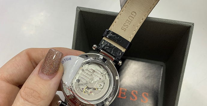 Скелетонизированные механические часы. Корпус украшен кристаллами. Кожаный ремешок с классической застежкой.