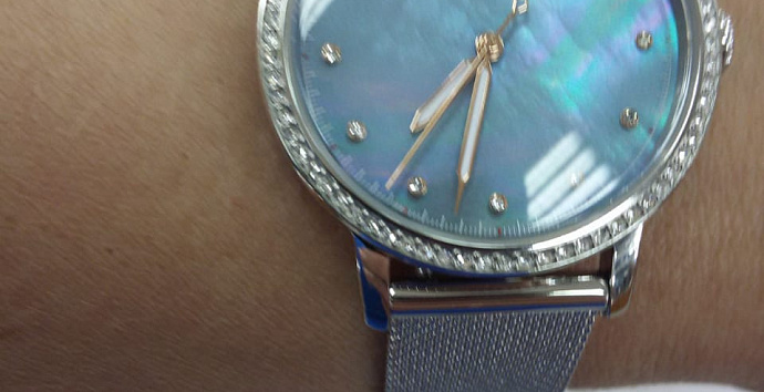 Циферблат перламутрового цвета, стрелки покрыты люминесцентным составом, что обеспечит вам более легкое считывание информации в вечернее время.