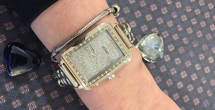 Муж сделал подарок на годовщину. Часы с прямоугольным корпусом и необычным браслетом. Выполнены из нержавеющей стали. Вокруг циферблата обрамление камнями. Минеральное стекло. На руке смотрятся круто!